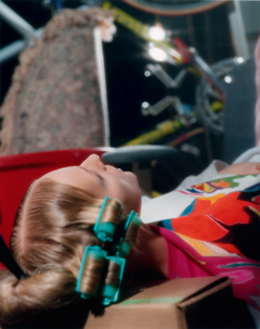 Black plastic garbage bags on walls and floor. Face towards camera, arms a bit splayed out. Bright red lips, immaculate hair. She never moves. She is fully decked out. Then trying to read some books.